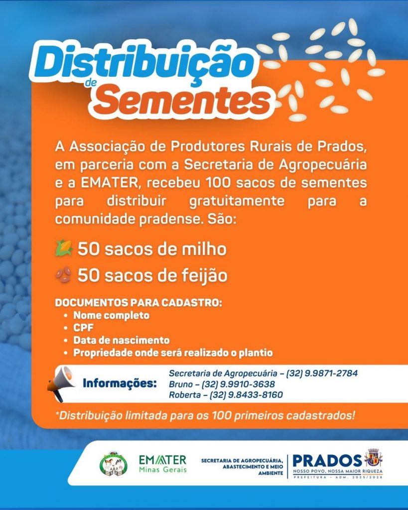 A Associação, em parceria com a Secretaria Municipal de Agropecuária e a EMATER, recebeu 100 sacos de sementes que serão destinados à comunidade pradense, com foco no fortalecimento da agricultura local e no apoio aos pequenos produtores.