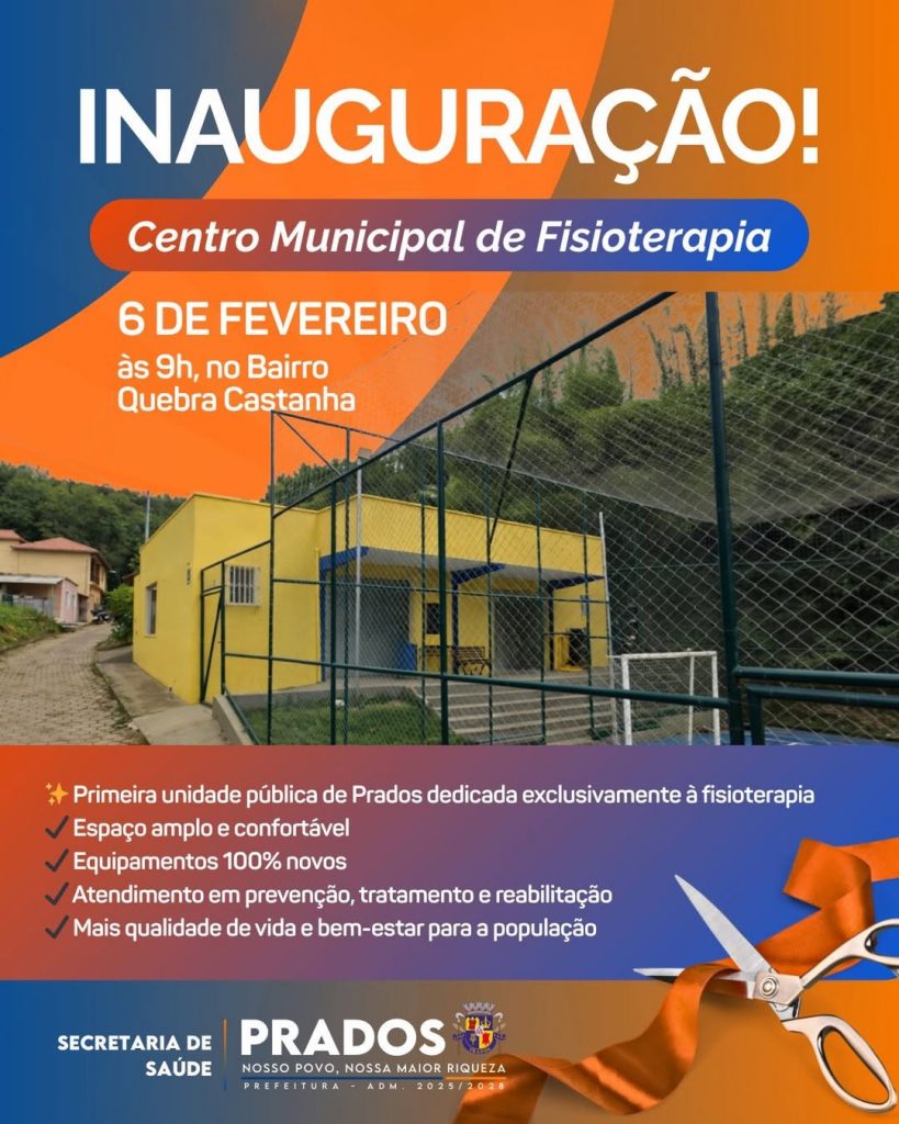 Prados dá mais um passo importante no fortalecimento da saúde pública. Na próxima sexta-feira, dia 06 de fevereiro, a partir das 9h, a Prefeitura inaugura o Centro Municipal de Fisioterapia, a primeira unidade pública do município dedicada exclusivamente a atendimentos fisioterapêuticos.